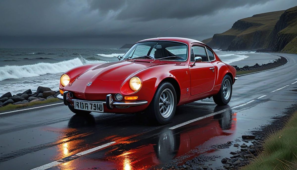 A striking picture of a vintage Alpine A110 sports car speeding along a coastal road in Scotland at dusk. The image is rendered as a textured gouache and acrylic painting with an expressionistic, neo-impressionist style.