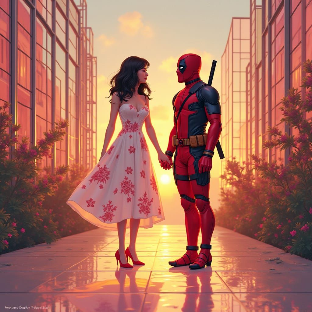 This image shows two figures standing in a futuristic city constructed from stained glass. One figure wears a floral dress and red heels, the other stands alongside in a superhero costume.