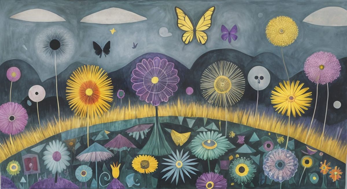 A striking picture of winged fairies in a dark meadow filled with dandelions. The image features many bright colorful details in an abstract art style, with a brooding grayscale balanced by colorful elements.