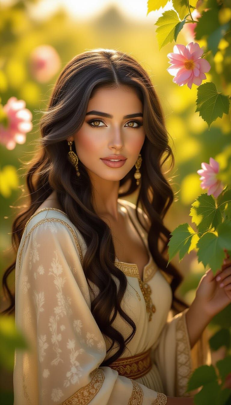 This image shows a dignified Middle Eastern woman in a vineyard, bathed in soft golden light. It evokes a poetic biblical atmosphere with photorealistic detail and luminous, earthy tones.