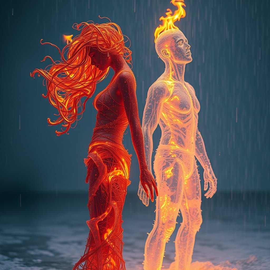 A striking image of a woman made of dancing flames and a man of falling rain and ice. The surreal scene blends fire and water elements in a dreamlike aesthetic.