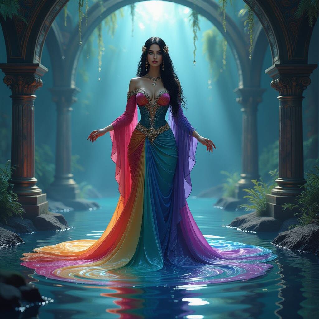 A highly detailed digital painting of a woman composed of swirling rainbow liquids, adorned in ornate liquid attire. Ethereal lighting creates an otherworldly atmosphere.