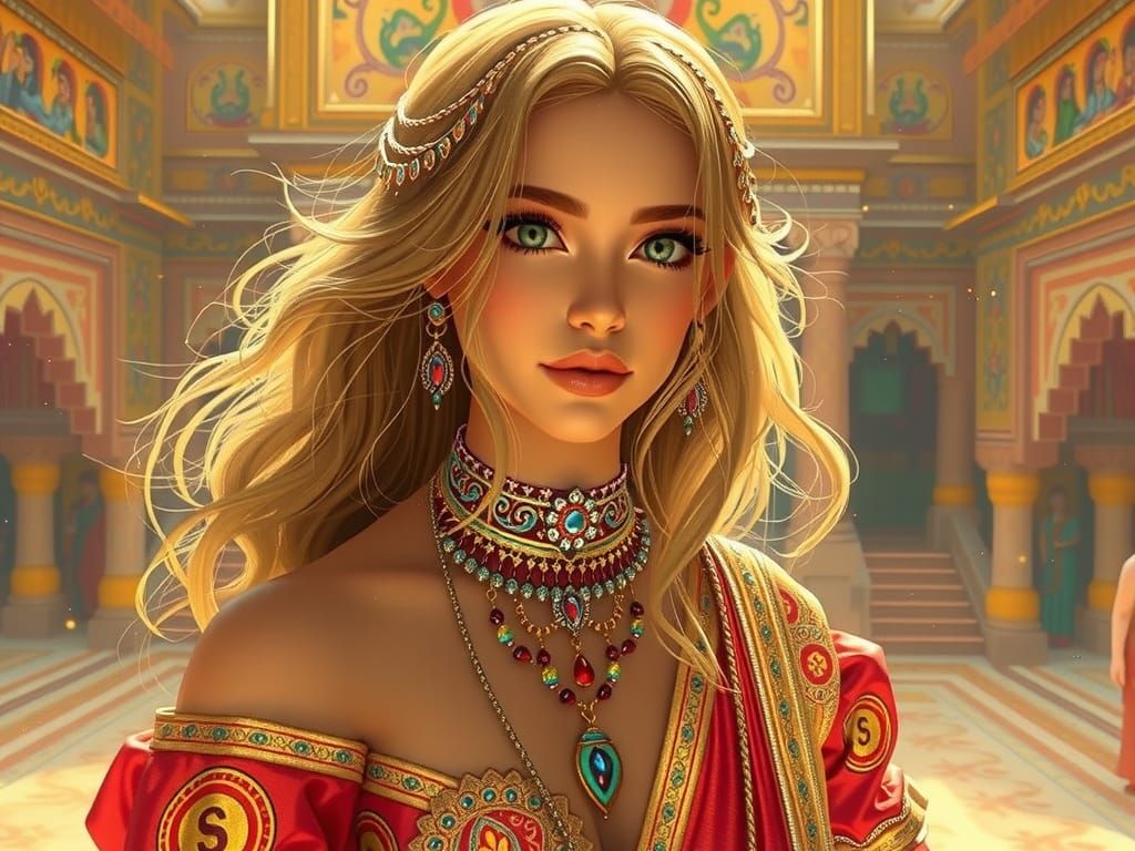 colourful young apsara courtesan in colourful (ancient) Indian sabha adorned with intricate mosaics and golden symbols, with a jeweled string, jeweled arms, a proud face, intricate hair, angled eyebrows, detailed matte painting, deep color, fantastical, intricate detail, splash screen, complementary ...