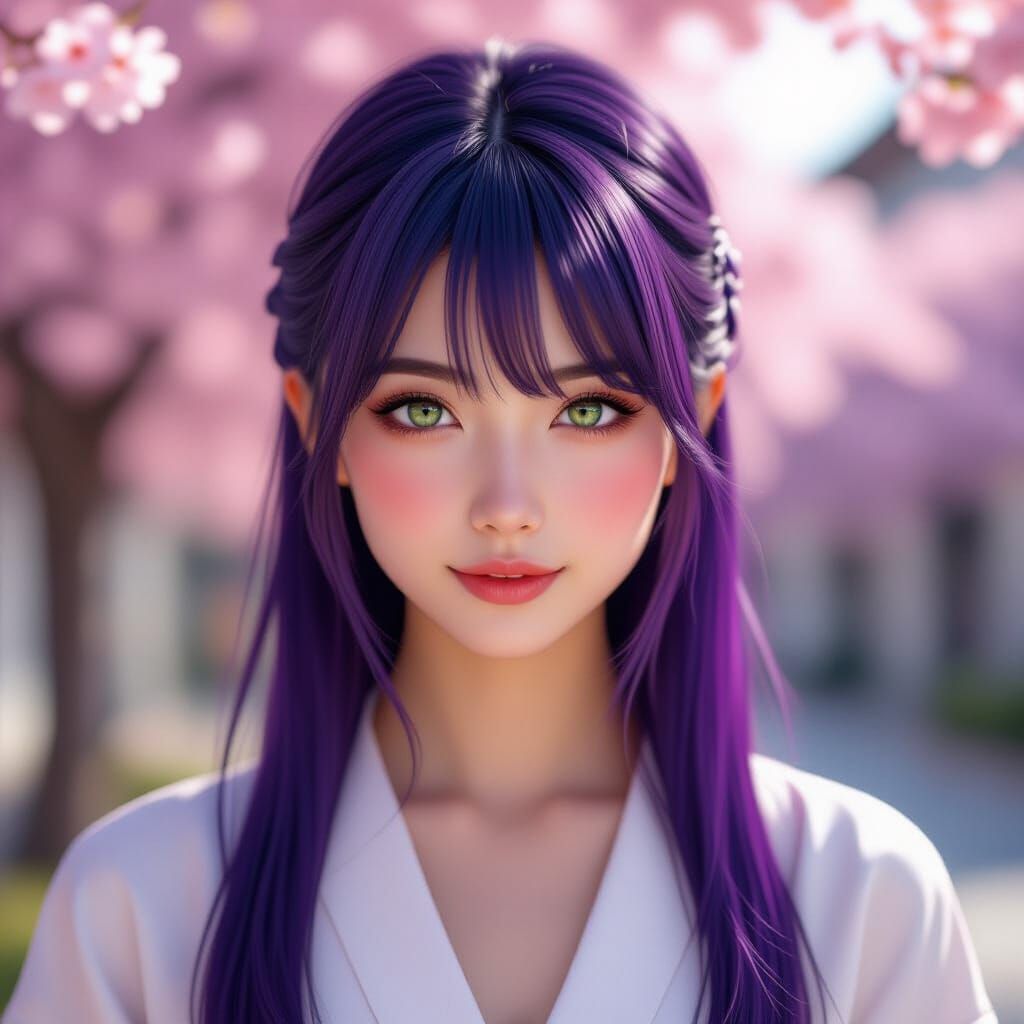 A photorealistic image of a young Japanese woman with vivid purple hair sitting in a cozy izakaya. She has bright green eyes and a playful yet dangerous charm, depicted with warm lighting and soft shadows.