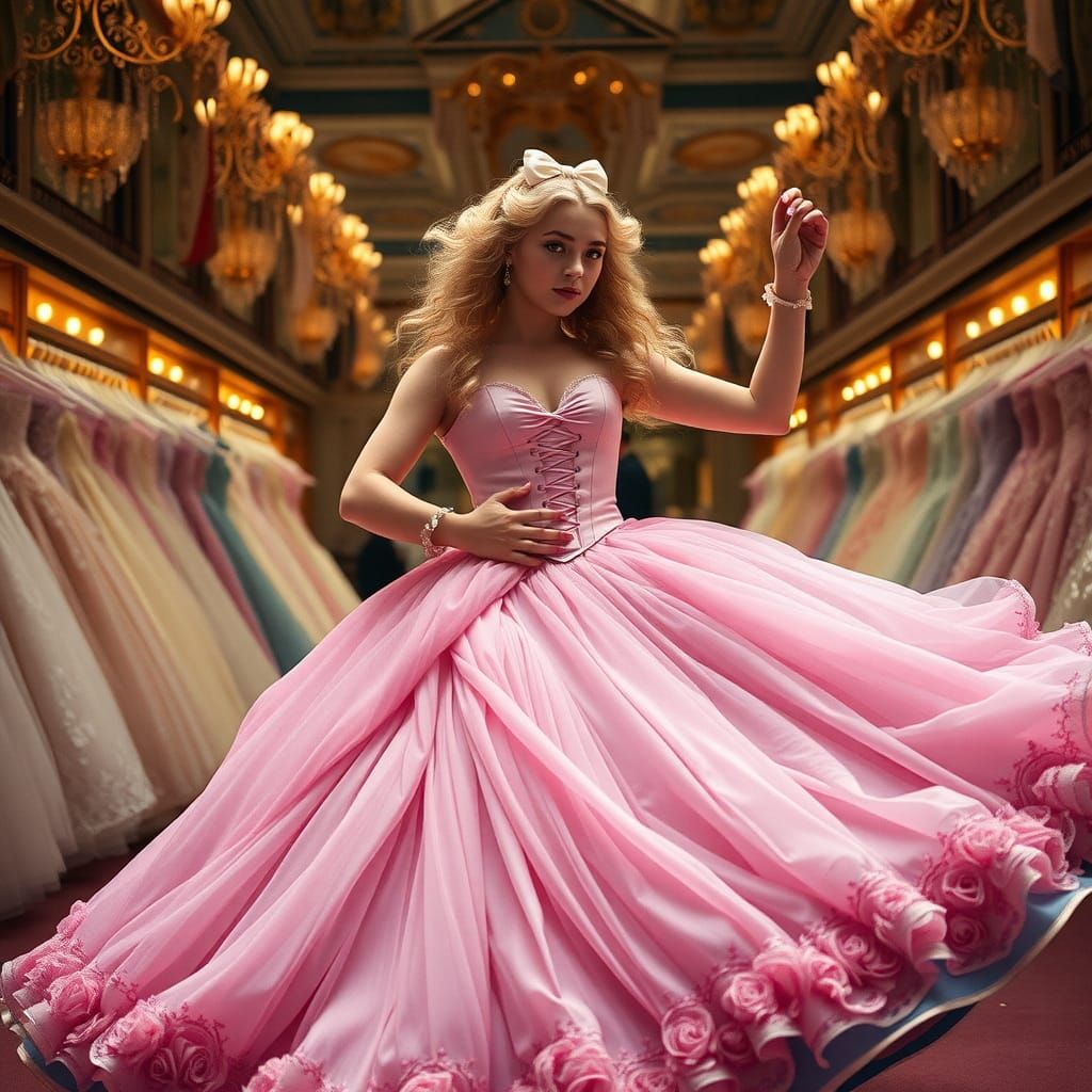 This image captures a dramatic cinematic moment of a boy in a pink and blue ball gown spinning a girl in an opulent bridal shop, bathed in warm, filmic light.