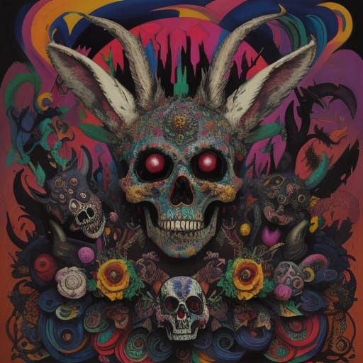This surreal illustration depicts a grotesque rabbit hole overflowing with stolen riches and adorned with skulls, featuring jagged lines and clashing colors in an unsettling, expressionist style.