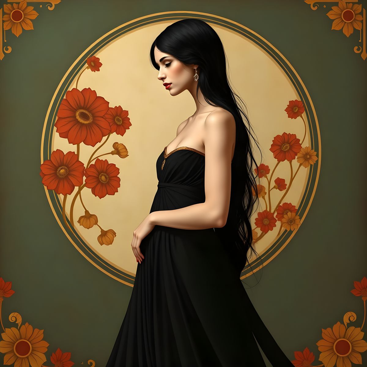 A captivating image of a dancer with long, flowing dark hair, reclining on a polished wood floor. She wears ballet slippers and a flowing gown, rendered with Art Nouveau elements.