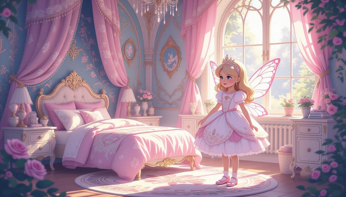 This image shows a young girl embodying Barbie within a detailed fairycore bedroom. Soft light and whimsical elements create a dreamlike atmosphere in a vibrant illustrative style.