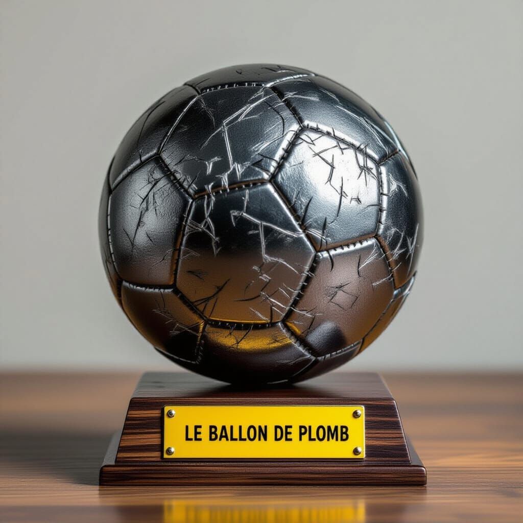 This image shows a heavily damaged lead soccer ball trophy with dents and scratches, set on a wooden base. The dark metallic matte finish and subtle reflections add to its weathered appearance.