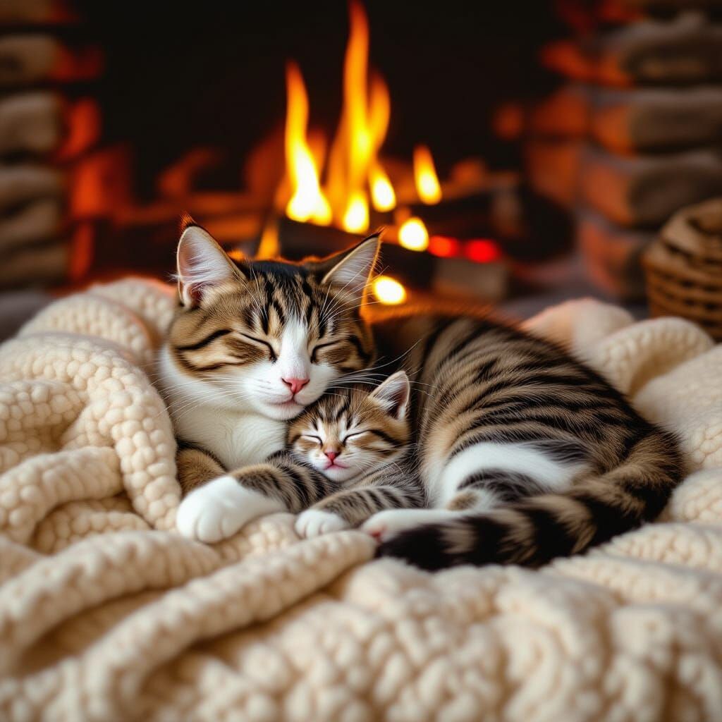 This image shows a mother cat and her kitten asleep by a fire. The scene evokes a warm, pastoral style with golden lighting, reminiscent of classic storybook illustrations.