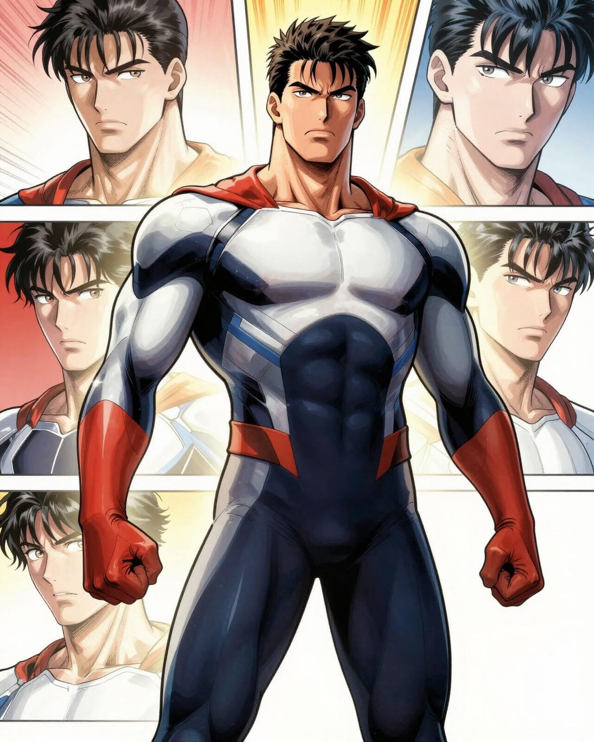This image features a fit white male superhero in a dynamic webtoon art style. He wears a modern suit and is posed heroically with bold outlines and expressive coloring.