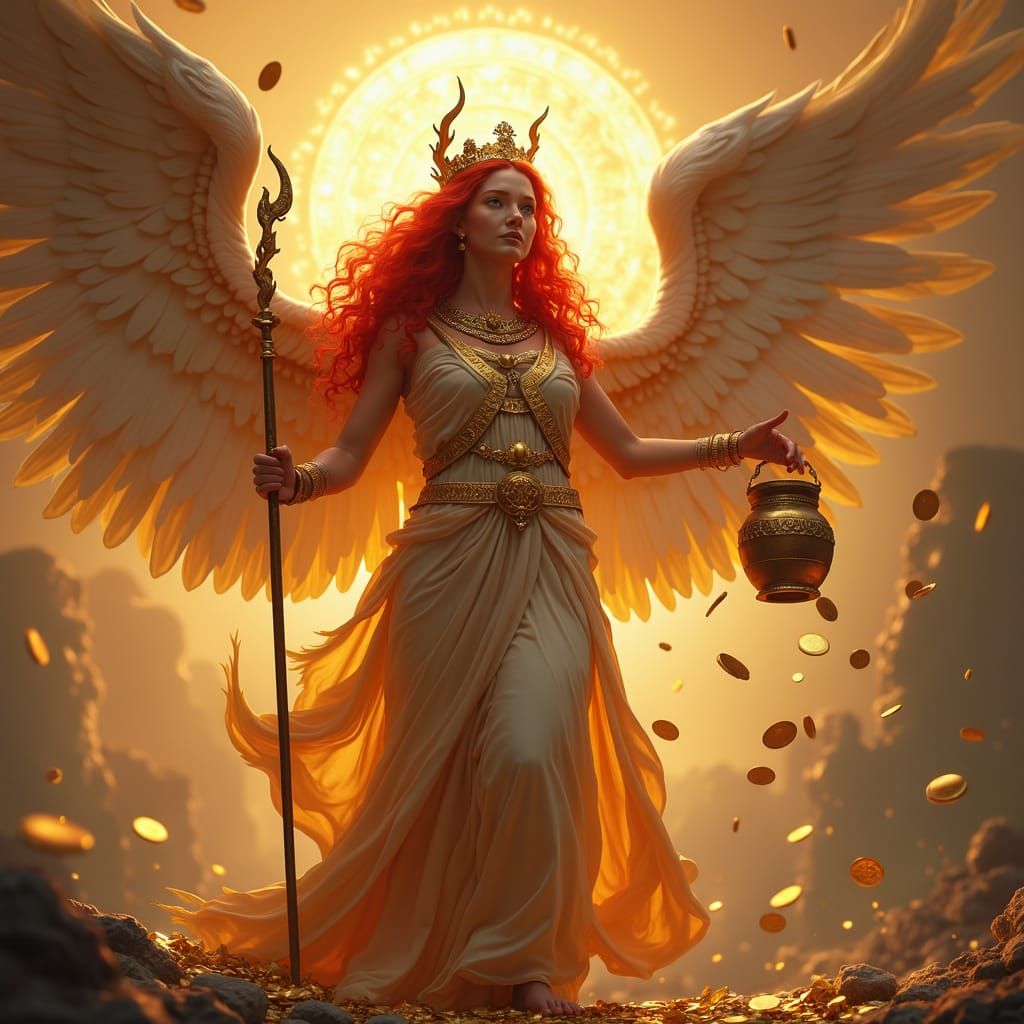 A vibrant image of a winged Greek goddess with flowing red hair, holding a scepter and jar. Gold coins emanate from her hands, set against a backdrop of radiant light in a detailed matte painting style.