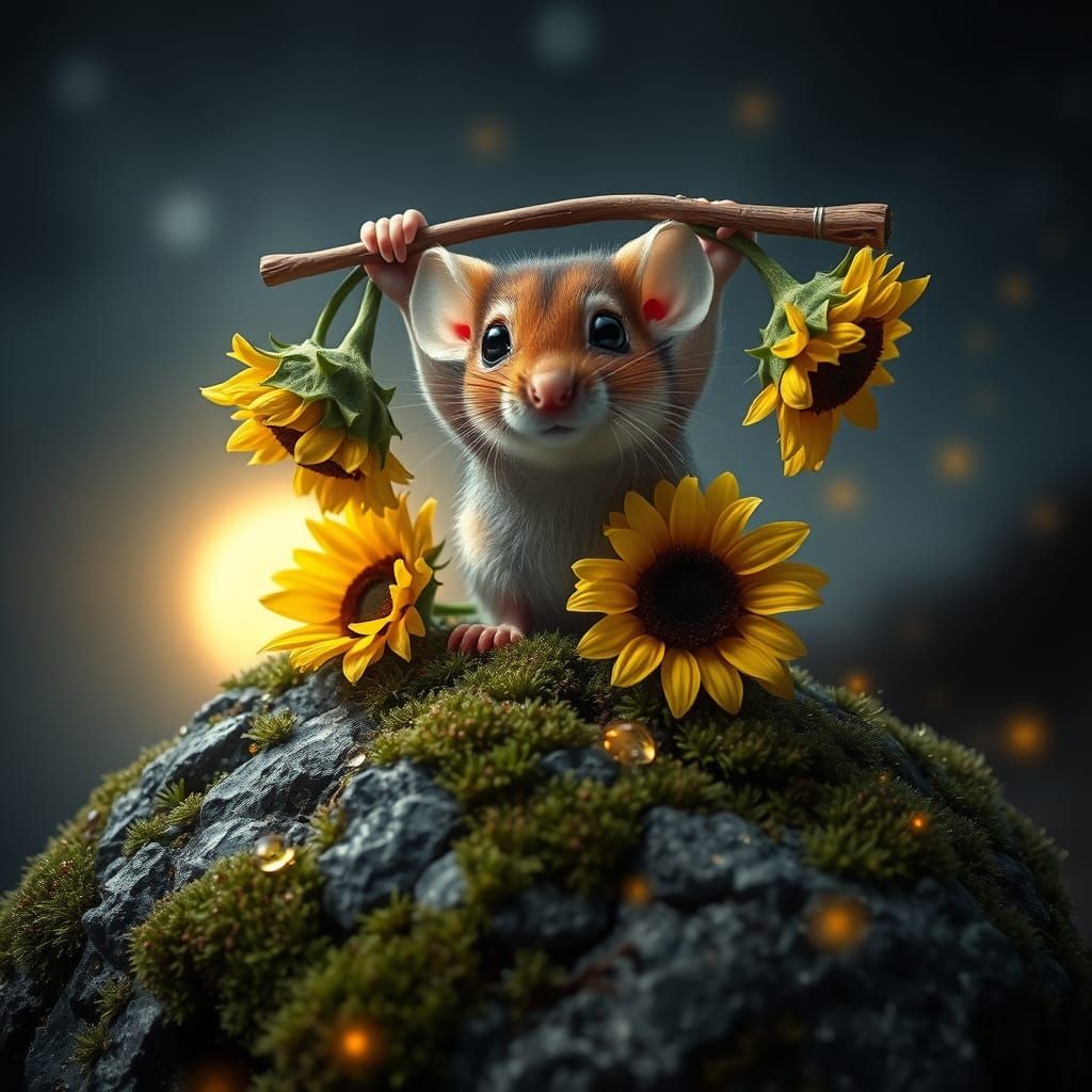 This image shows a tiny, adorable mouse sitting on a mossy rock, lifting a stick with sunflowers. The mouse has large, expressive eyes, dense fur, and is surrounded by fireflies in a dimly lit, magical setting.