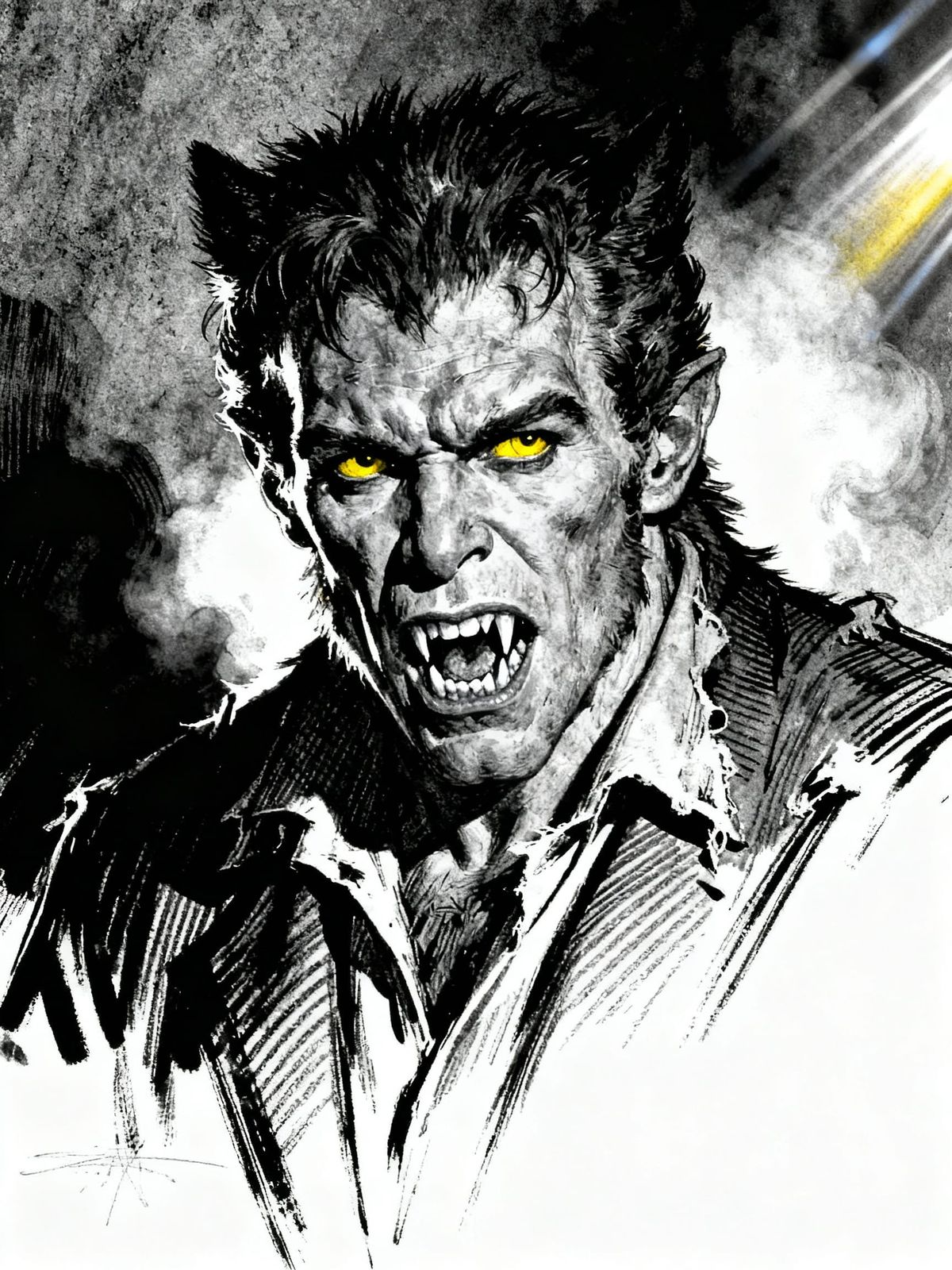 This striking image features a menacing Wolfman from classic horror, captured with dramatic lighting and bold linework. The portrait evokes fear and somber anticipation, rendered in a dynamic sketch style with textured detail.