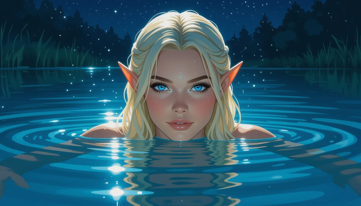 This image shows a blonde elf woman swimming in a tranquil lake at night. Only her head and shoulders are visible, her blue eyes sparkle, and the water reflects delicate light in a photorealistic style.