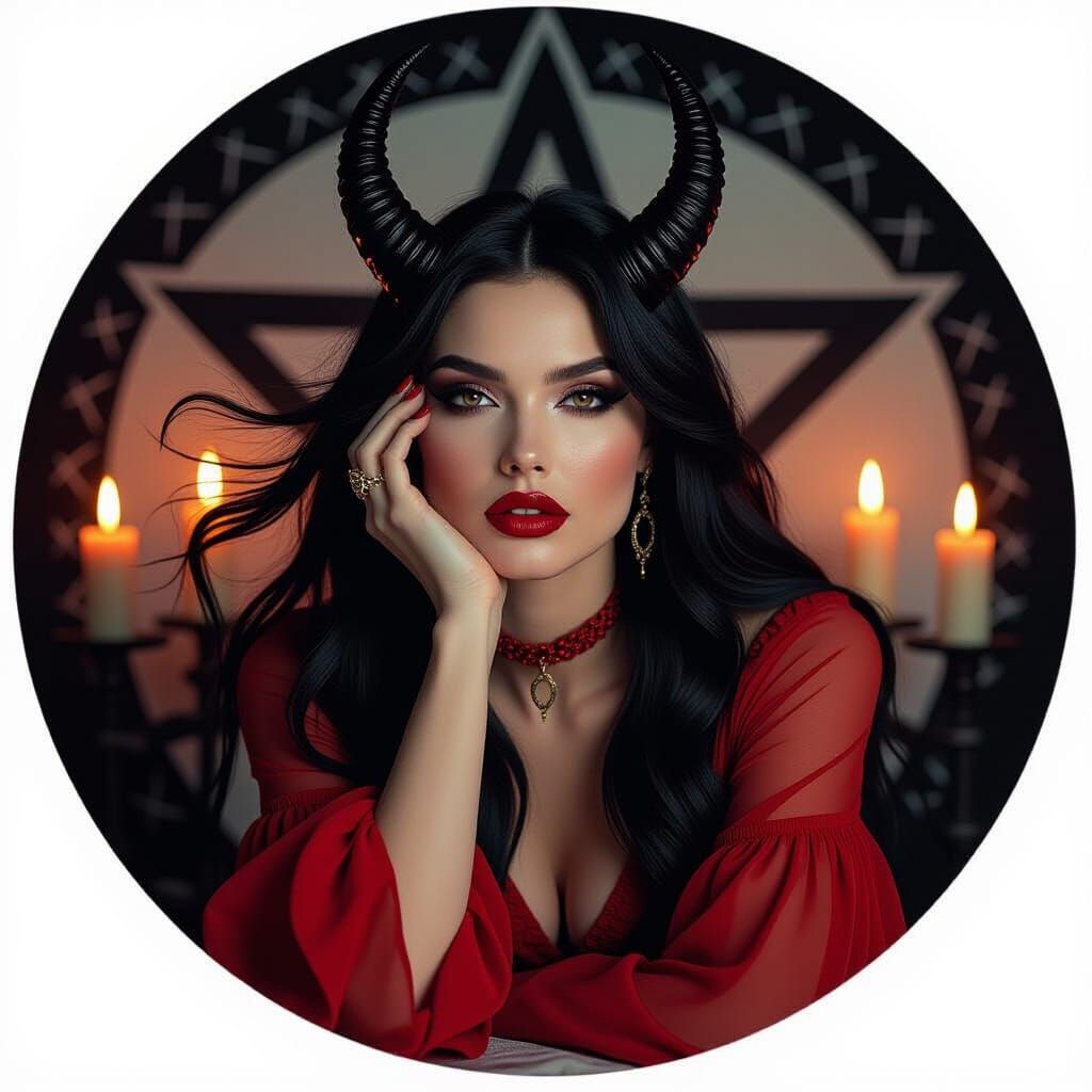 This image shows a striking goddess with long black hair and horns. She wears dramatic makeup and a red chiffon top, posing against a black pentacle tapestry in cinematic style. The image features film grain and vignette effects.