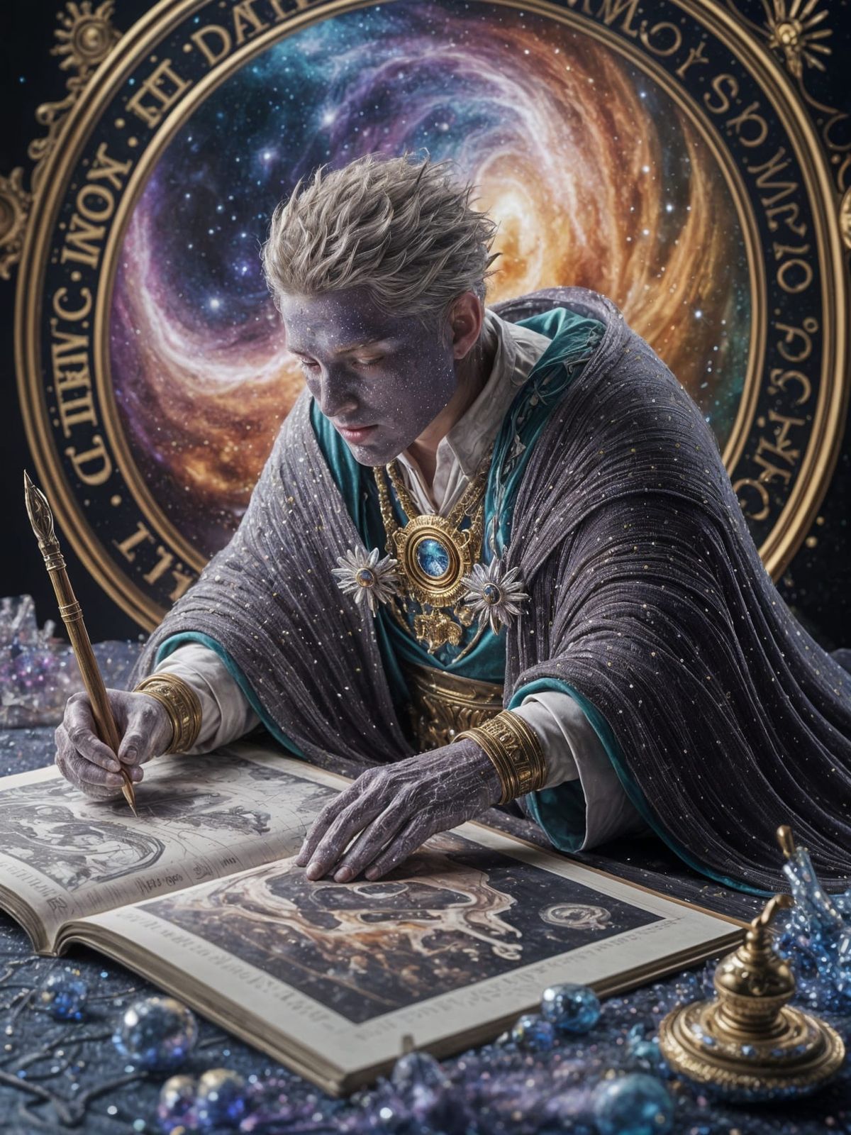 This image shows a cosmic mapmaker creating galaxies with tools of starlight and nebula ink. Rendered with hyperdetailed textures and dynamic lighting, it evokes an Art Nouveau digital painting.
