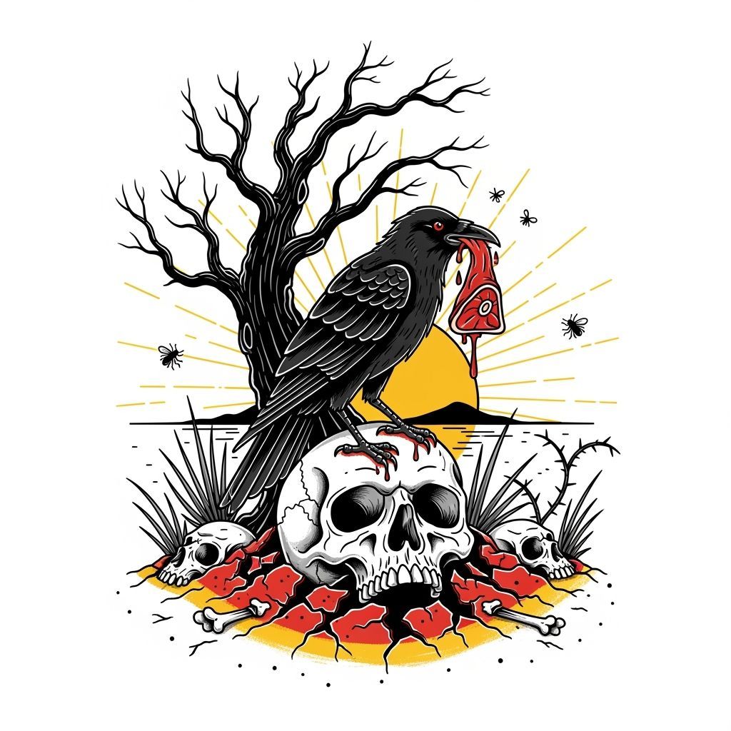 A striking picture of a skull and crow tattoo design in a neo-traditional style. The image features bold outlines, high contrast shading, and a limited color palette of black, red, yellow, and bone white.