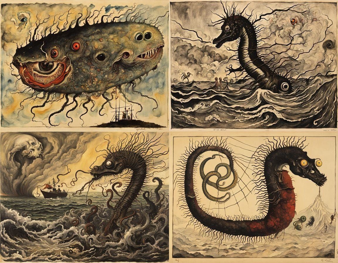 This image depicts a surreal and nightmarish scene of a violent lightning storm, blending elements of 1940s Japanese art with the disturbing and grotesque. The scene is reminiscent of the works of Dali and Tapies, with a focus on the darker aspects of the human experience.