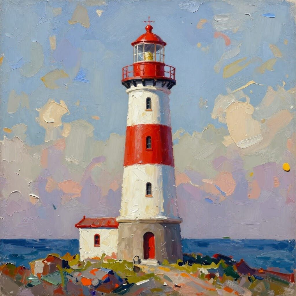 This image depicts a lighthouse rendered in a maximalist impressionist style. Thick, textured brush strokes of gouache and watercolor create a matte painting effect on canvas.