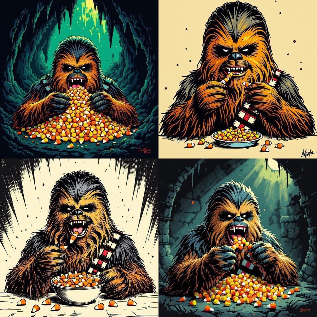 This image depicts Chewbacca enjoying candy corn, rendered in a retro underground comix style inspired by Tim Burton, with a vintage comic art aesthetic.