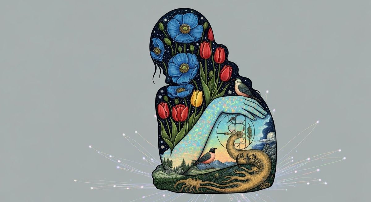 This image shows a woman composed of stars, flowers, and birds, symbolizing the connection between humanity and nature. This dreamlike concept art visualizes inner peace and cosmic energy, with detailed illustrations and vibrant colors.