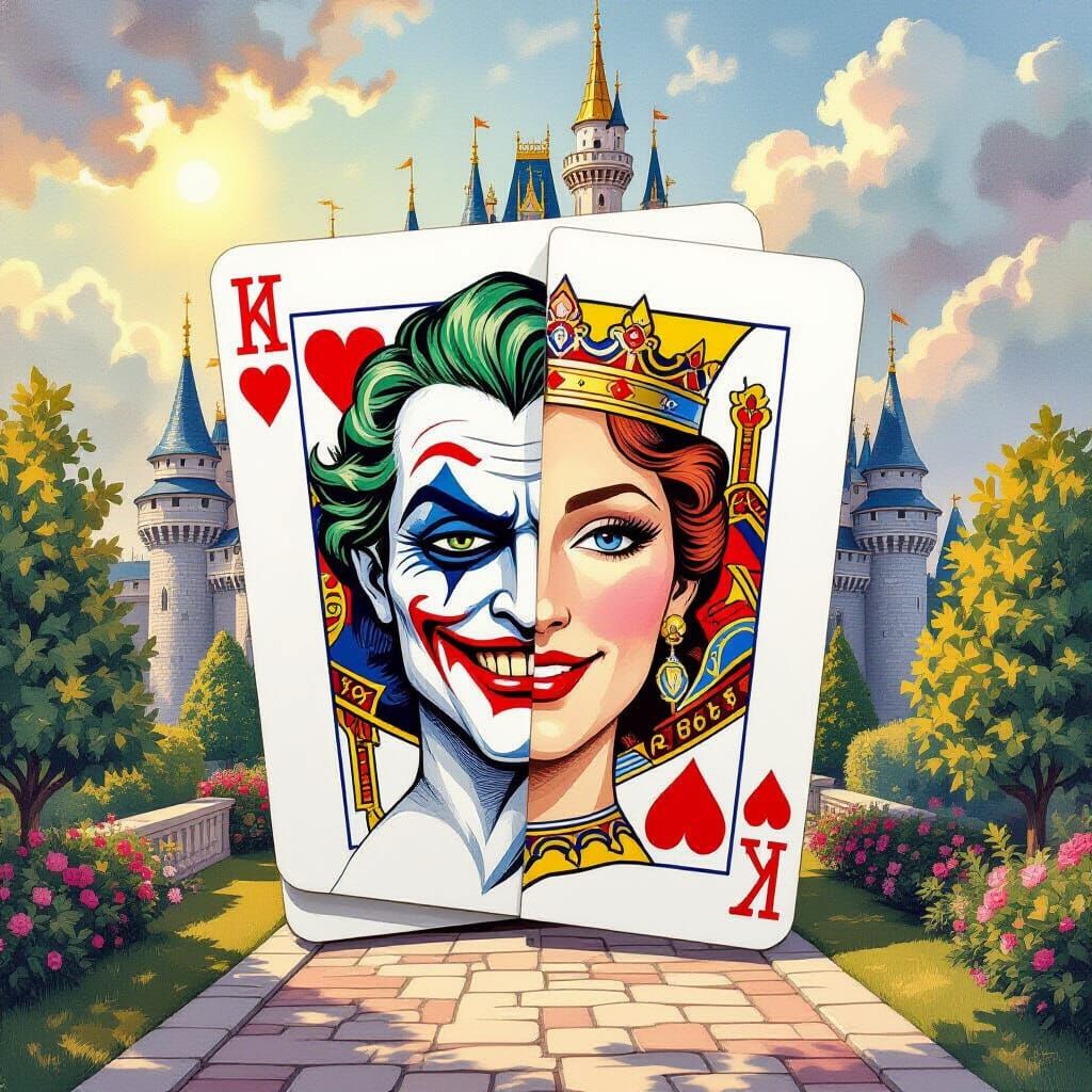 This 3D gouache painting depicts a joker's face on cards deceiving a queen's face. Features a hidden king, castle, and golden sunshine with watercolor textures, in an impressionist masterpiece style.