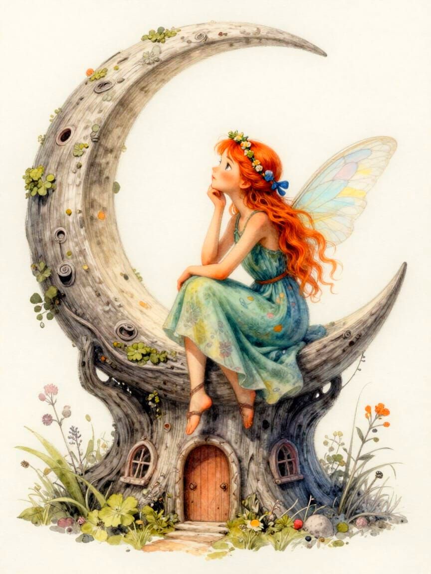 This image features a detailed watercolour sketch of a fairy resting on a crescent moon house. The artwork is vibrant and stylised, capturing a serene moment.