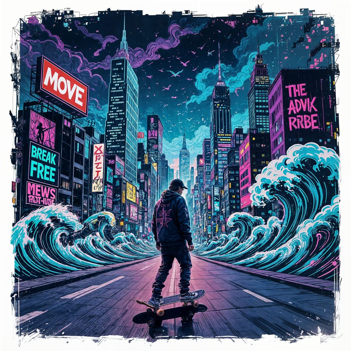 A dynamic graphic t-shirt design showcasing a lone skateboarder navigating a surreal urban landscape. The vivid color palette, graffiti accents, and hand-drawn feel evoke a rebellious, youth-focused energy.