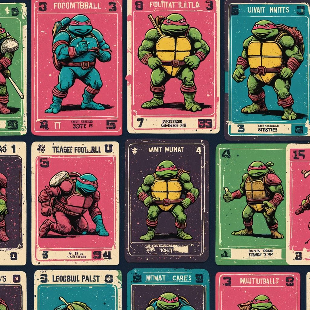 This image shows a risograph print of vintage football cards. The cards, in a Garbage Pail Kids style, feature the Teenage Mutant Ninja Turtles. The print uses halftone textures and bold colors.