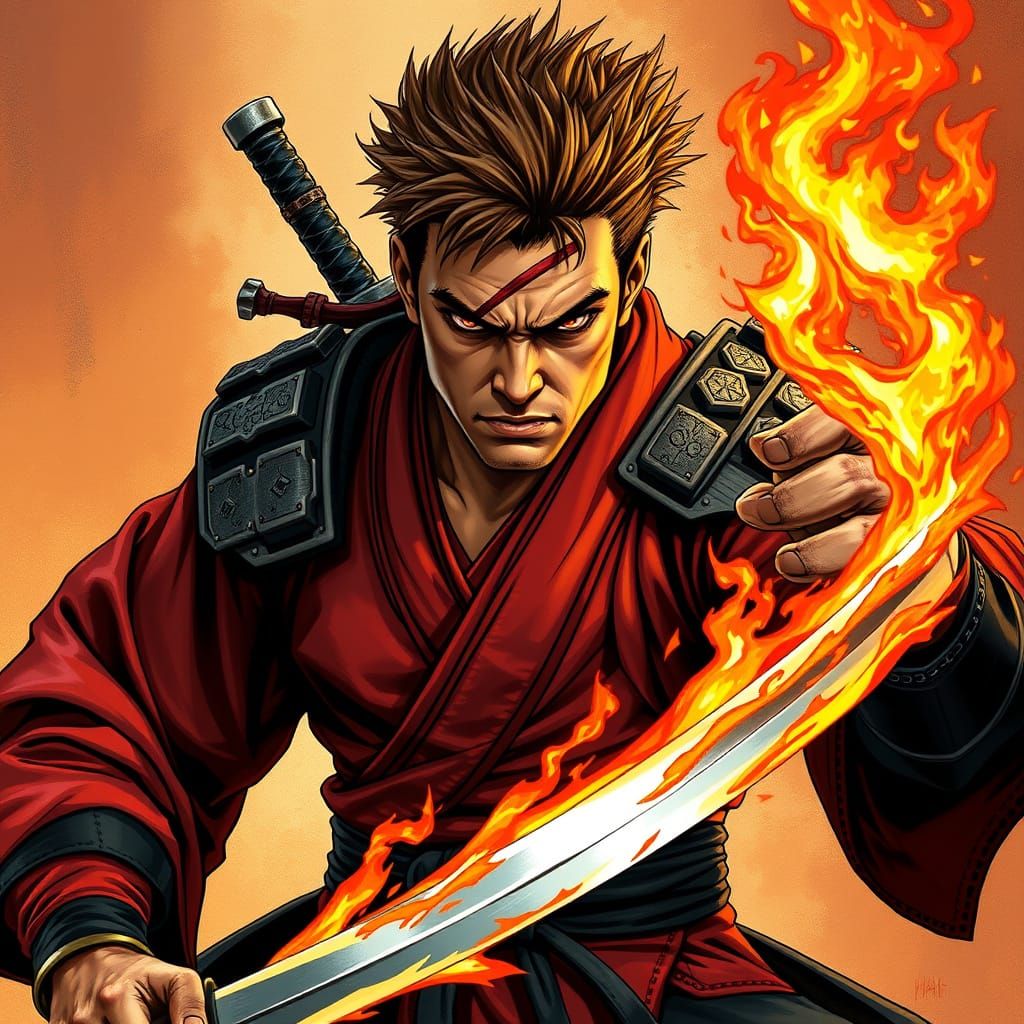 This image shows a rugged, gritty warrior in a fierce fighting pose, clad in a red and black kimono, with a katana and flames engulfing his hand, exuding a serious and angry expression.