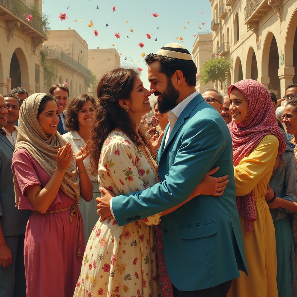 A heartwarming image of Jewish and Muslim people embracing, surrounded by joyous children and women in a vibrant Middle Eastern setting. The scene evokes folk art with colorful patterns and a joyful atmosphere.