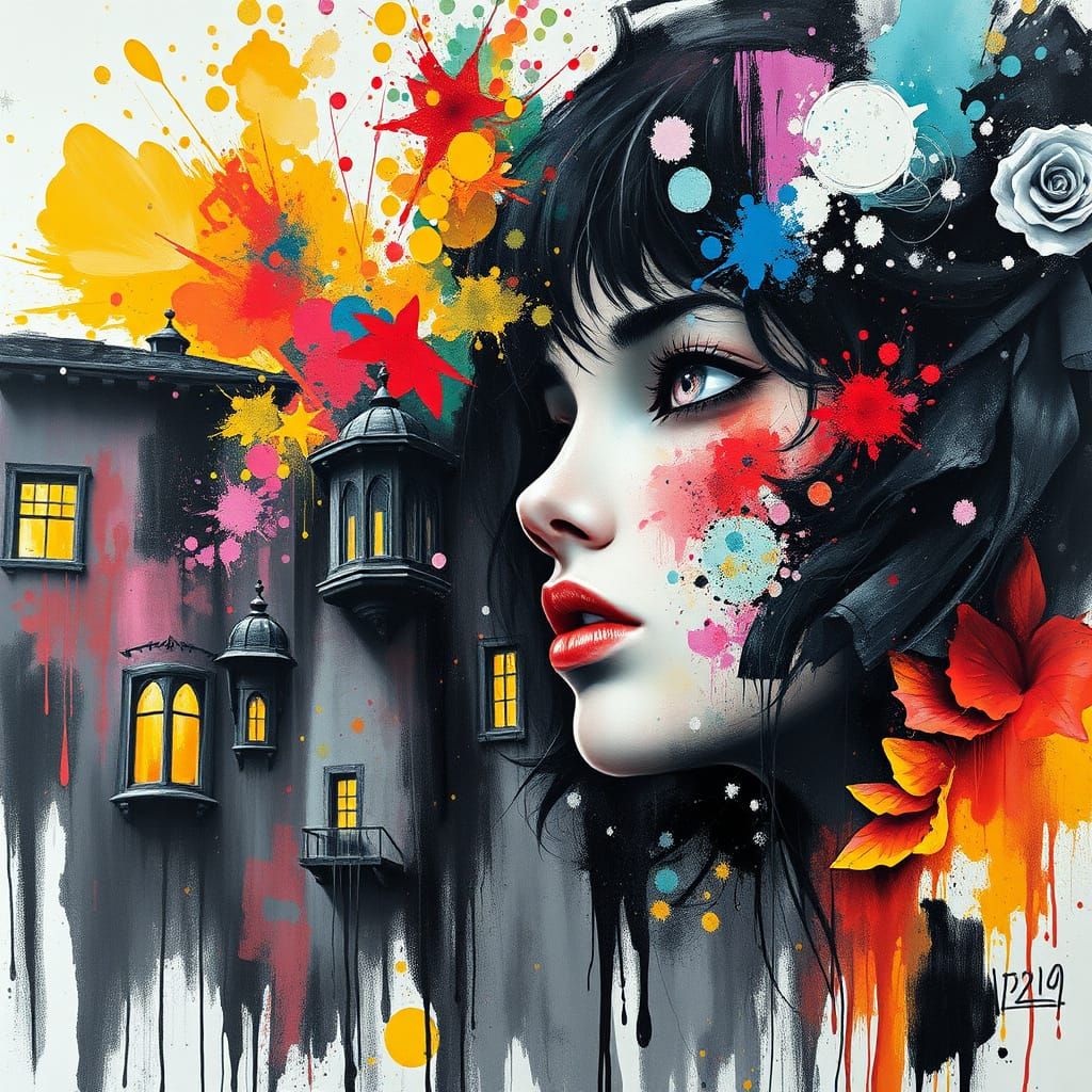 A vibrant charcoal drawing of colorful lilies with extreme detail. This image showcases elements of anime art and is rendered in a graffiti art style, with thick brush strokes and textured layers.