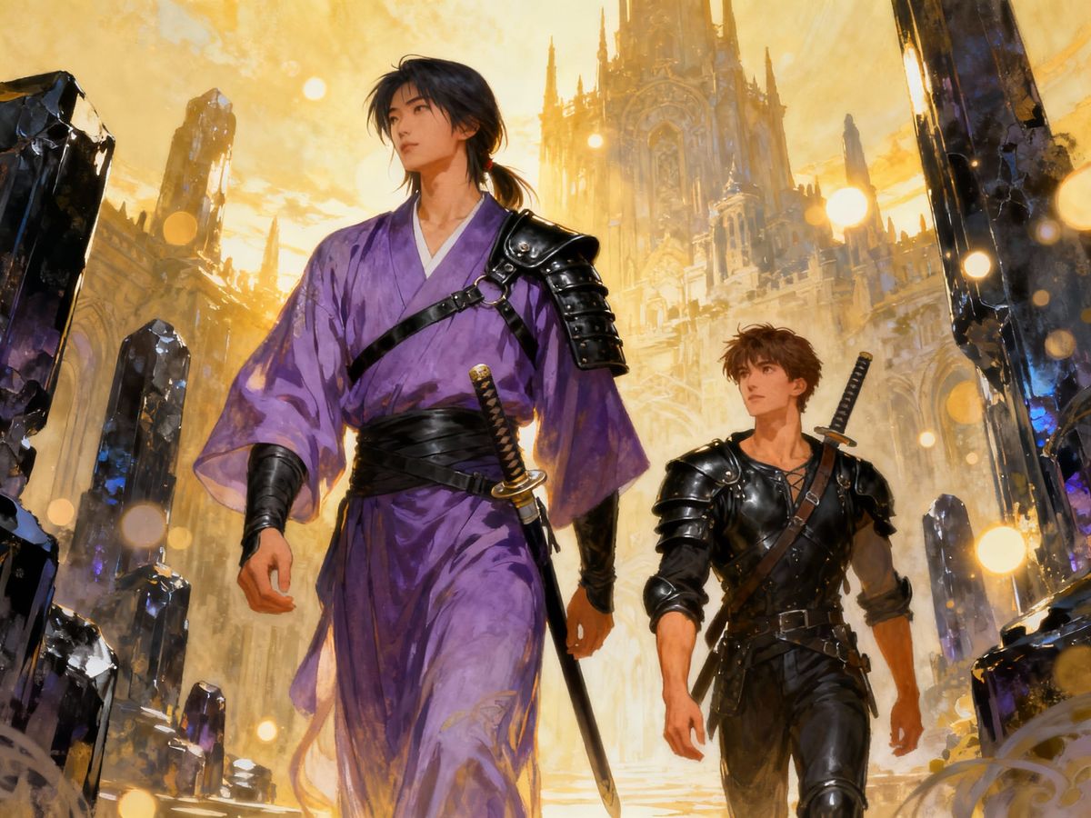 A striking digital painting of an ethereal Asian warrior in a lilac kimono and leather armor, walking through an obsidian citadel with volumetric lighting and a dreamy atmosphere.