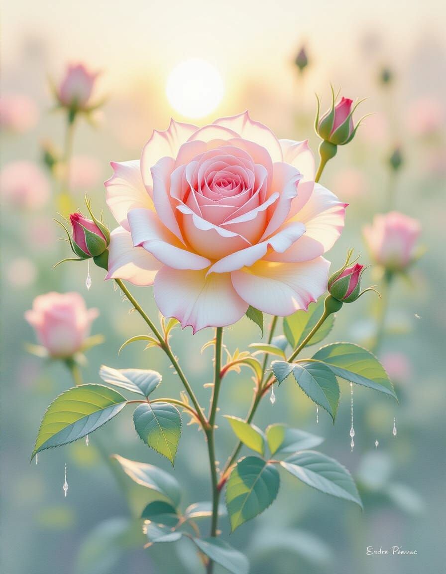 A delicate watercolor painting of a rose on a stem at sunset. Soft light and shadows create a mysterious, elegant scene with many fine details in a romantic aesthetic.