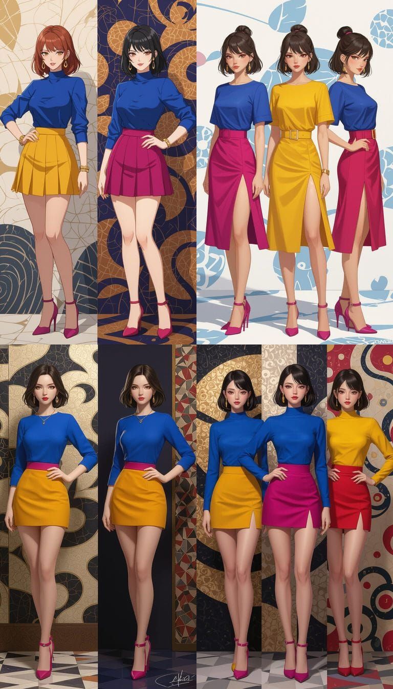This image shows a full-length portrait of a model in a vibrant color-block outfit. The art style is highly detailed, inspired by anime and digital concept art.