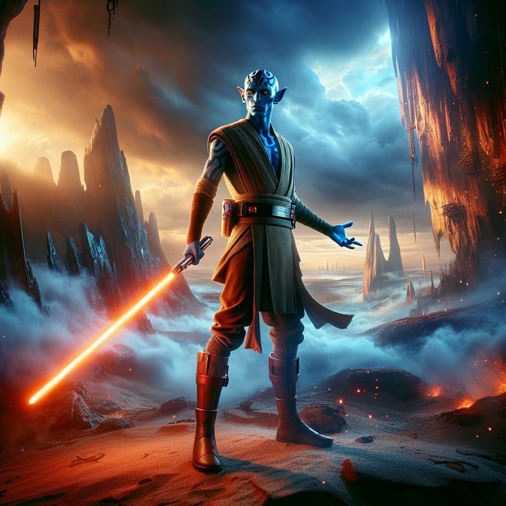 This image shows a blue-skinned Twi'lek Jedi wielding an orange lightsaber in a dramatic pose. The scene is set in a detailed, science-fiction landscape, rendered as a digital matte painting.