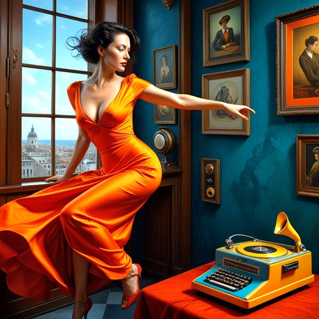 captivating full body shot of ravishing 40-year-old lady in fantastic surrealistic surroundings; fantasy, surrealism, photorealism, hyperrealism; colorful, vibrant luminous colors, bright intense colors, sharp, precise, high contrast, sharp focus, great focal depth, realistic textures, ultra quality, ...