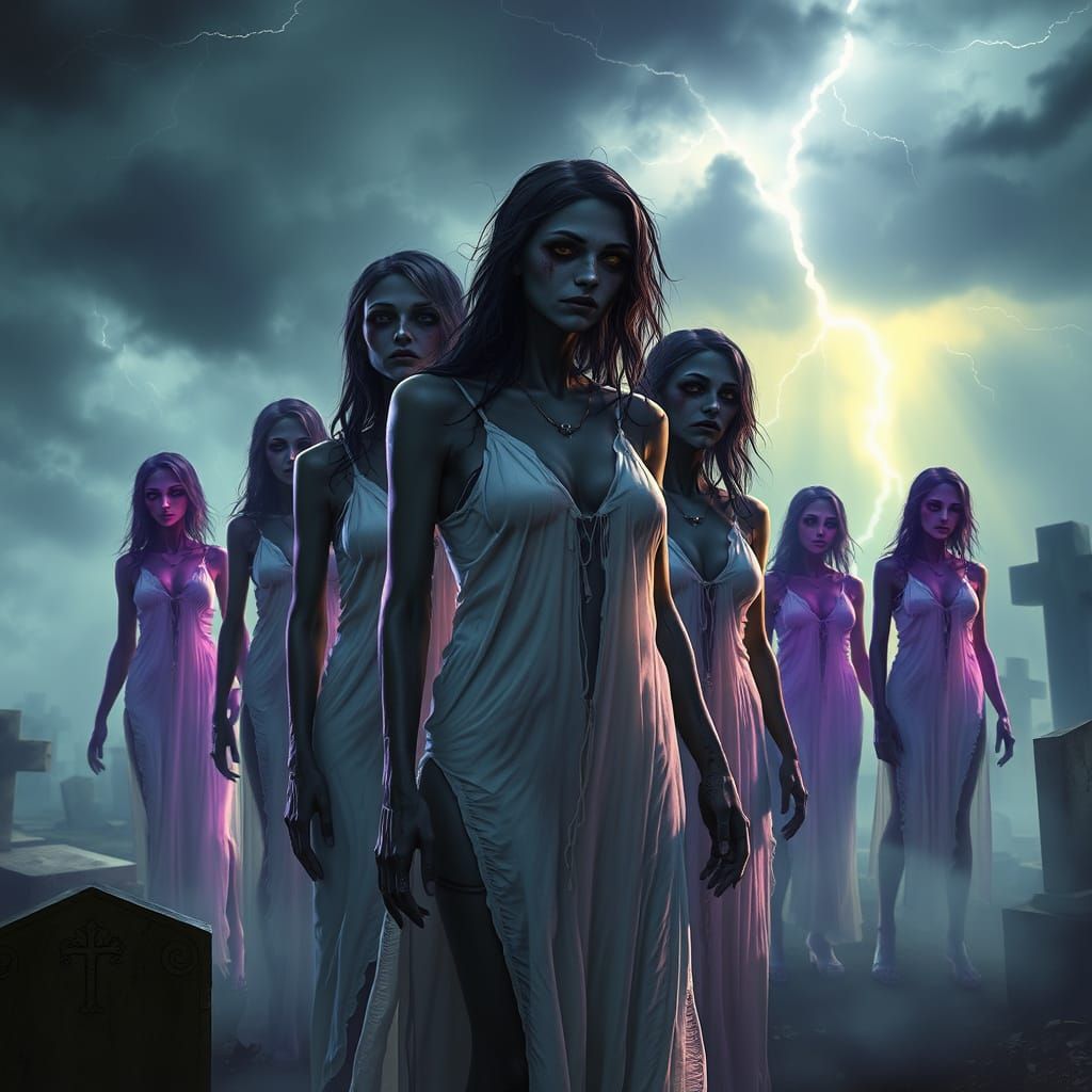 This image shows zombie women in tattered togas, a haunting choir in a cemetery under a stormy sky. The scene is rendered with vibrant colors and dynamic lighting, as dark fantasy concept art.