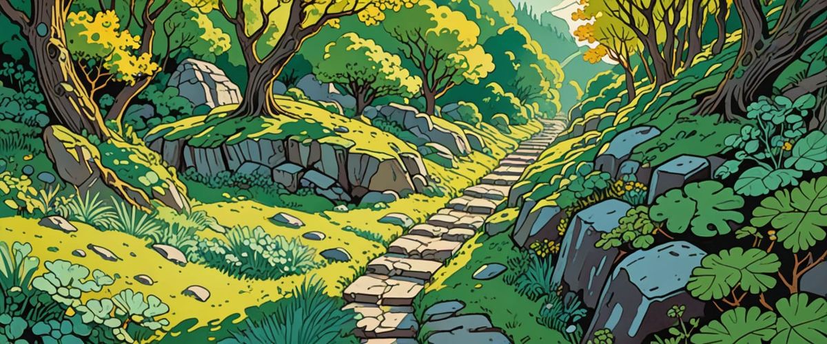 This image shows winding paths and stone walls under bright sunlight. The scene is rendered with vibrant watercolor textures and energetic brushstrokes in a comic book style with whimsical lighting.