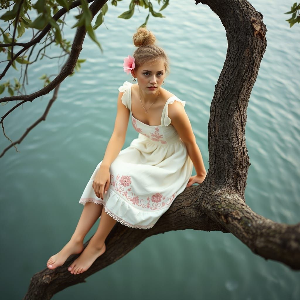This image shows a blonde woman in a vintage-style photographic portrait. She sits on a tree branch above calm water, wearing an embroidered off-white dress. The aesthetic is soft and serene.