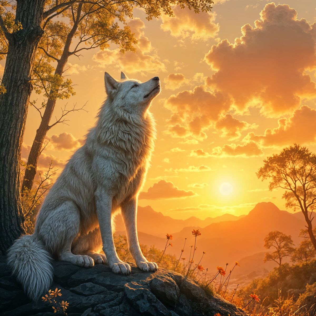 This image captures a poignant moment of a scarred white wolf standing alone amidst a vibrant summer sunset, surrounded by a whimsical and idyllic atmosphere reminiscent of a fairytale.