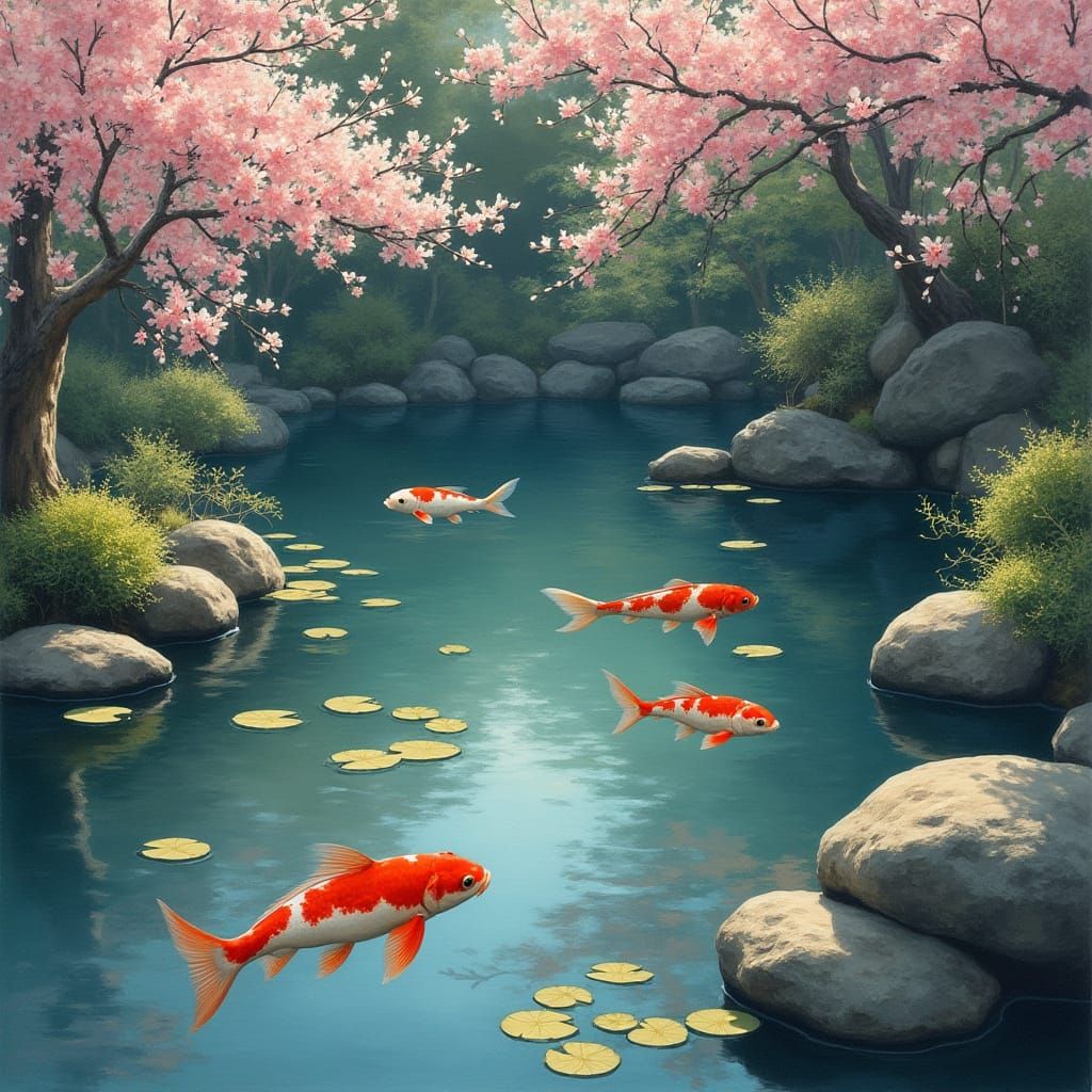 A tranquil koi pond scene in a Japanese garden. Colorful koi swim among lily pads as cherry blossoms fall. The art evokes impressionism with soft lighting and delicate details.
