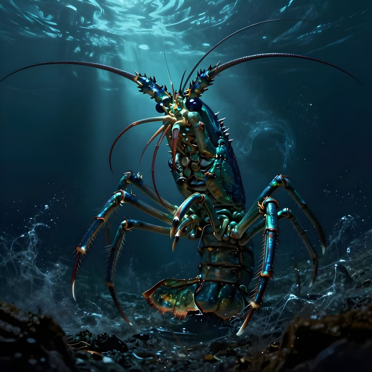 A terrifying, colossal mantis shrimp with iridescent blues and greens emerges from a stormy ocean. Rendered with dramatic chiaroscuro lighting and dark, swirling colors for a gothic horror effect.