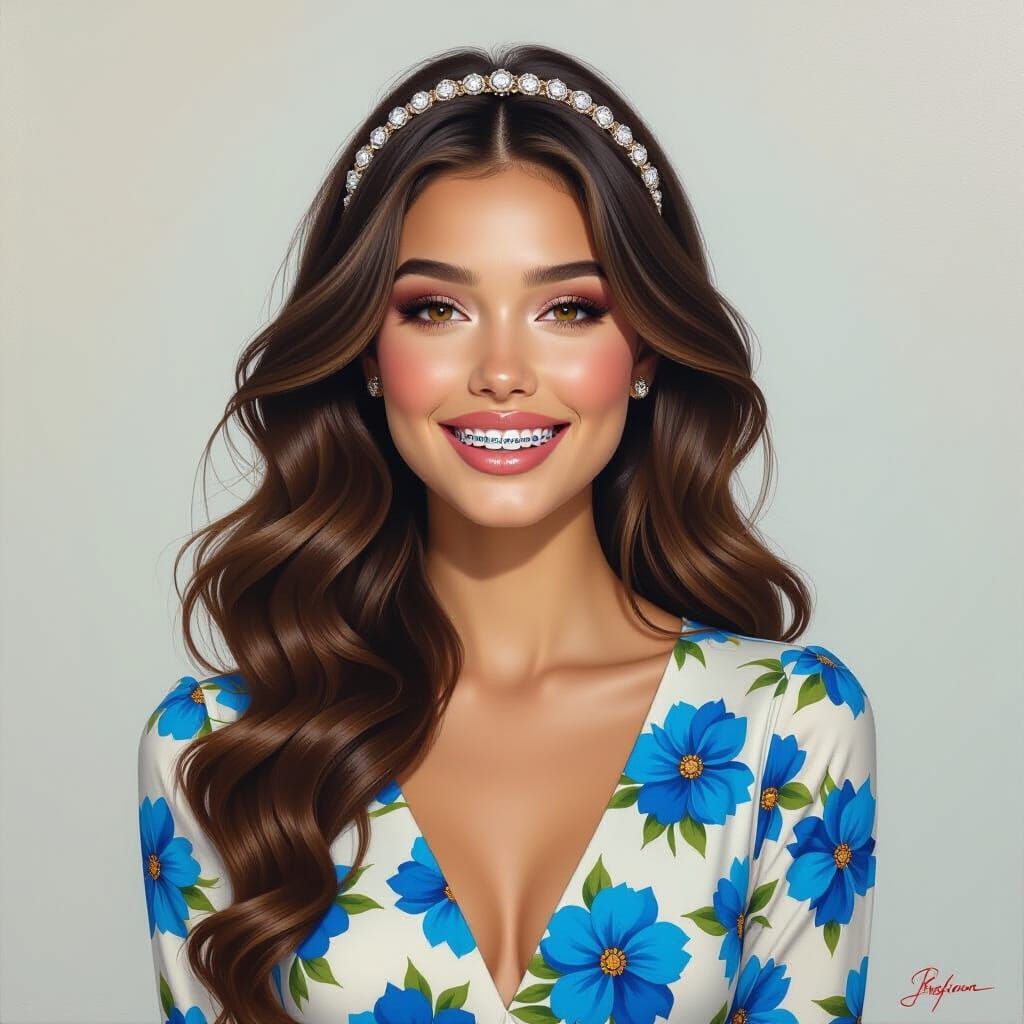 A portrait of a young woman wearing dental braces and a vibrant flower dress. The painting evokes the style of contemporary portraiture, with a focus on texture and elegant poses.