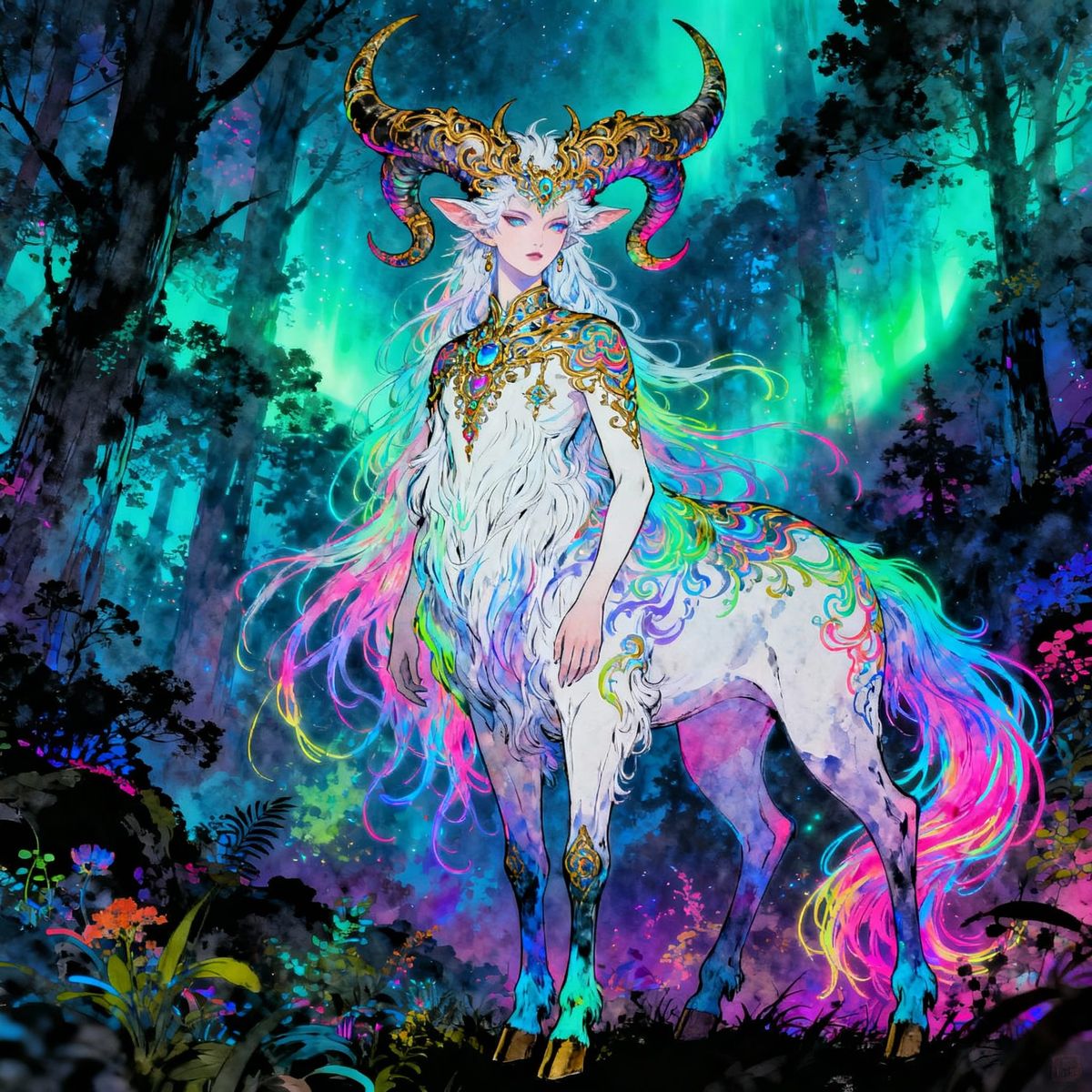 This image showcases a celestial cryptid with humanoid features, horns, and hooves, rendered in a detailed, neon-colored fantasy ink style with ornate linework. The creature possesses a mysterious, divine aura within an enchanting forest setting.