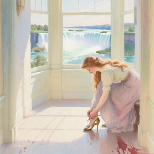 This image shows a beautiful woman with long hair putting on elegant shoes in a sun-drenched hallway, with a view of Niagara Falls. Rendered in a wet wash watercolor style with soft, bleeding colors.