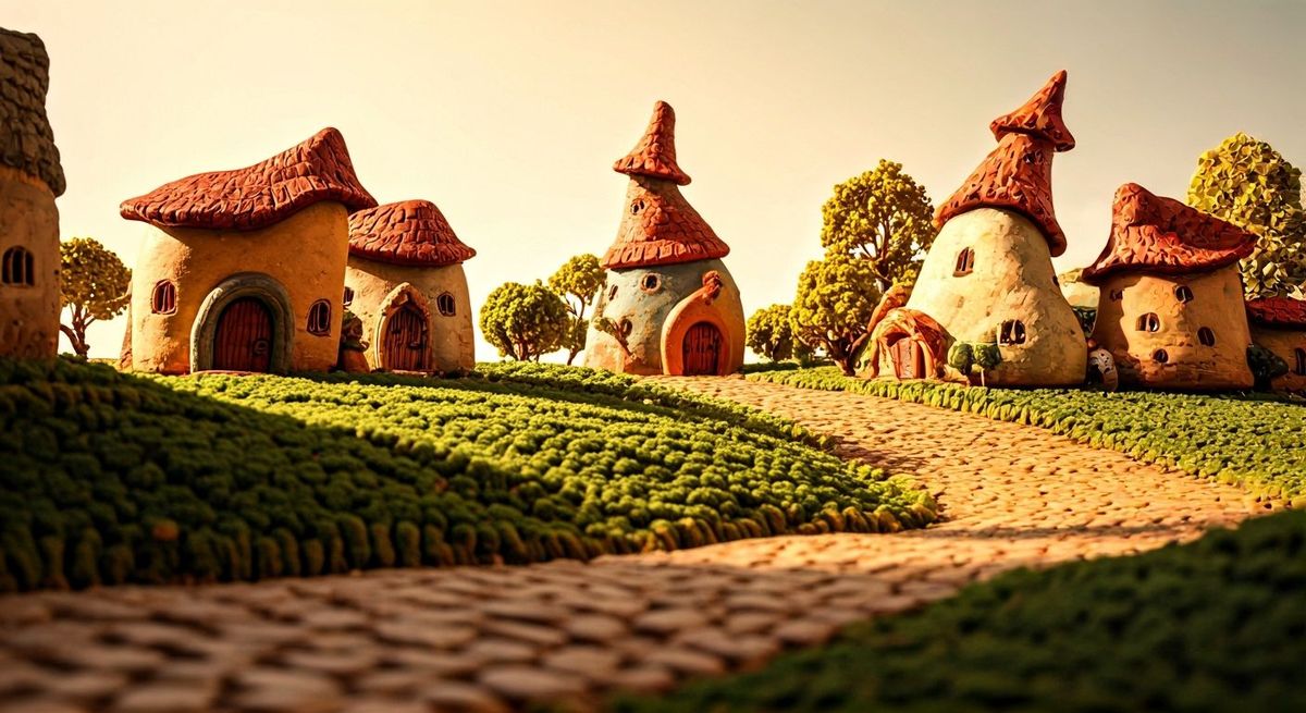 A charming image of a miniature clay village nestled in rolling hills. The whimsical architecture and vibrant colors evoke a fantastical, dreamy atmosphere in an illustrative style.