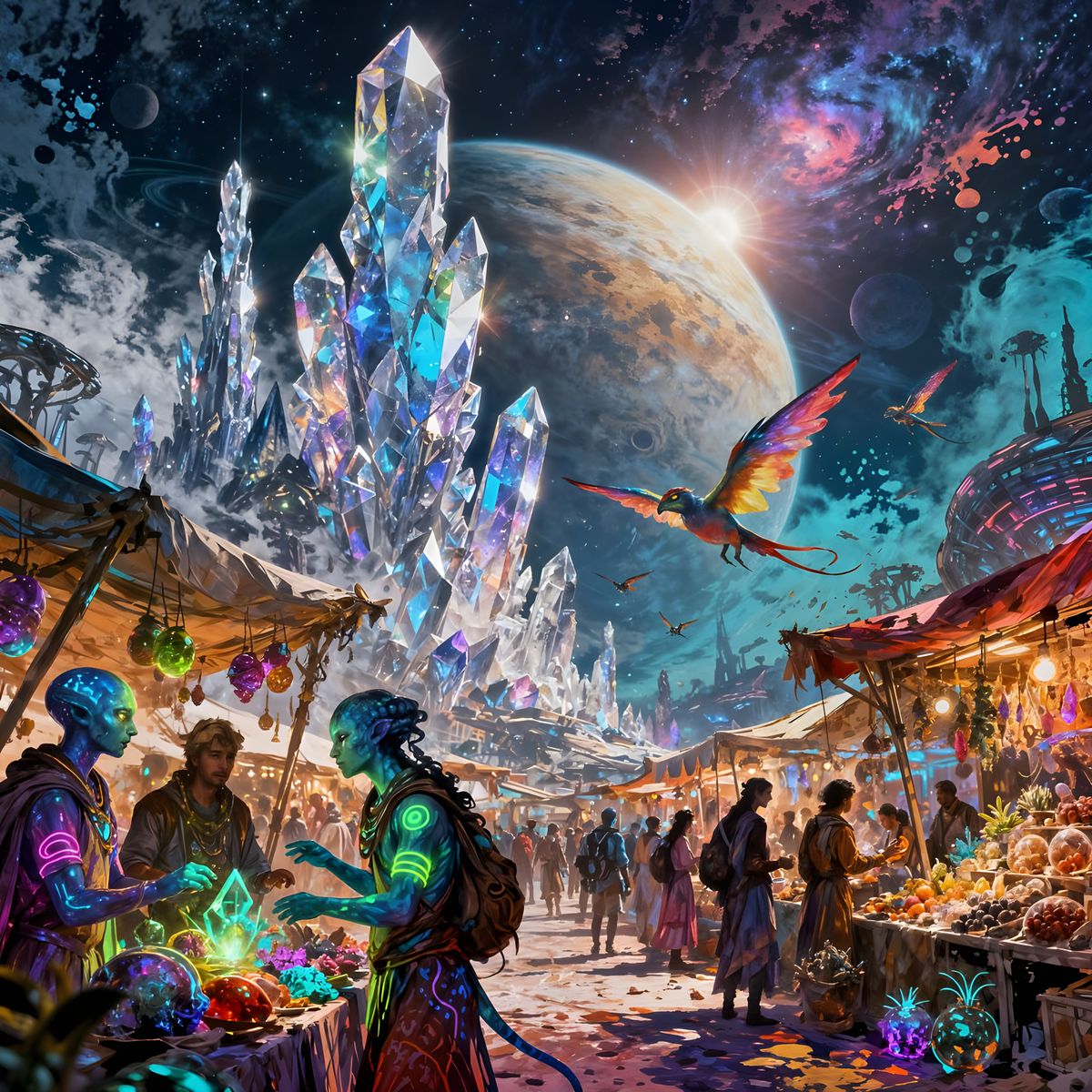 A vibrant splash art scene depicting a lively alien market on a moon. Traders with glowing skin exchange goods under crystalline towers and a thick atmosphere.
