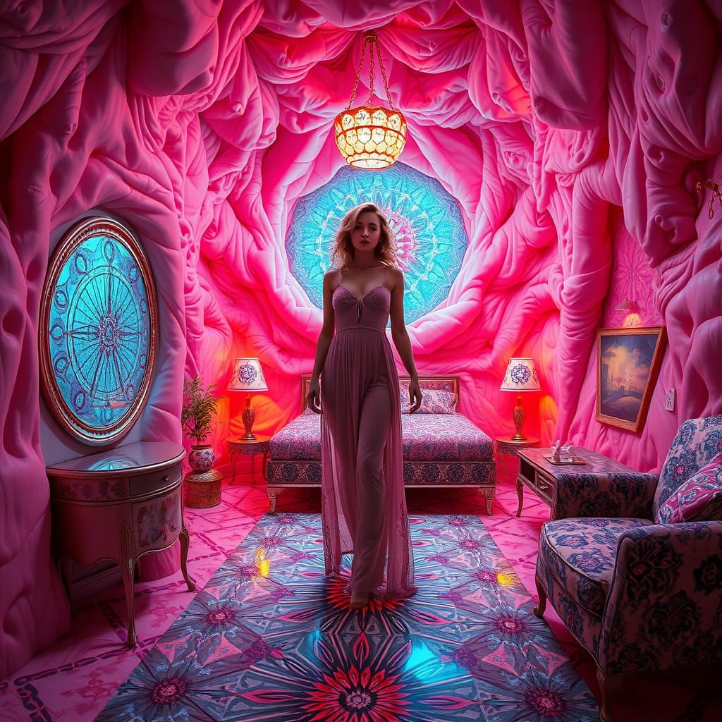 This image shows a woman surrounded by vibrant, kaleidoscope-patterned furnishings in a 3D, mind-enhancing environment with intricate, flesh-like walls and distorted accents, reminiscent of futuristic and psychedelic art styles.